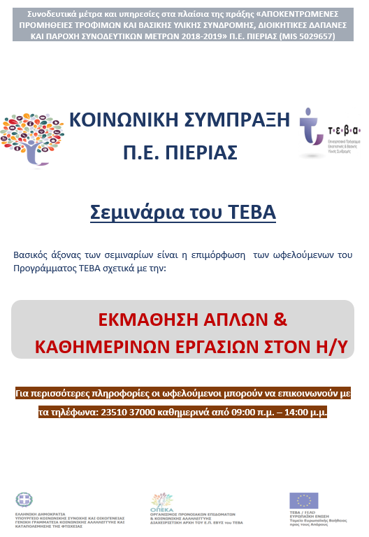Στον Δήμο Κατερίνης πραγματοποιήθηκαν σεμινάρια για την εκμάθηση βασικών και καθημερινών εργασιών στον ηλεκτρονικό υπολογιστή, με τη στήριξη του προγράμματος ΤΕΒΑ (Ταμείο Ευρωπαϊκής Βοήθειας για τους Απόρους). Αυτά τα σεμινάρια είχαν στόχο να βοηθήσουν τους ωφελούμενους του ΤΕΒΑ να εξοικειωθούν με βασικές τεχνολογικές δεξιότητες, όπως η χρήση λειτουργικών προγραμμάτων και εργαλείων του υπολογιστή. Η εκπαίδευση επικεντρώθηκε στην ενίσχυση της ψηφιακής εγγραμματοσύνης, κάτι που είναι σημαντικό για την καθημερινή ζωή και την ένταξη στην αγορά εργασίας.